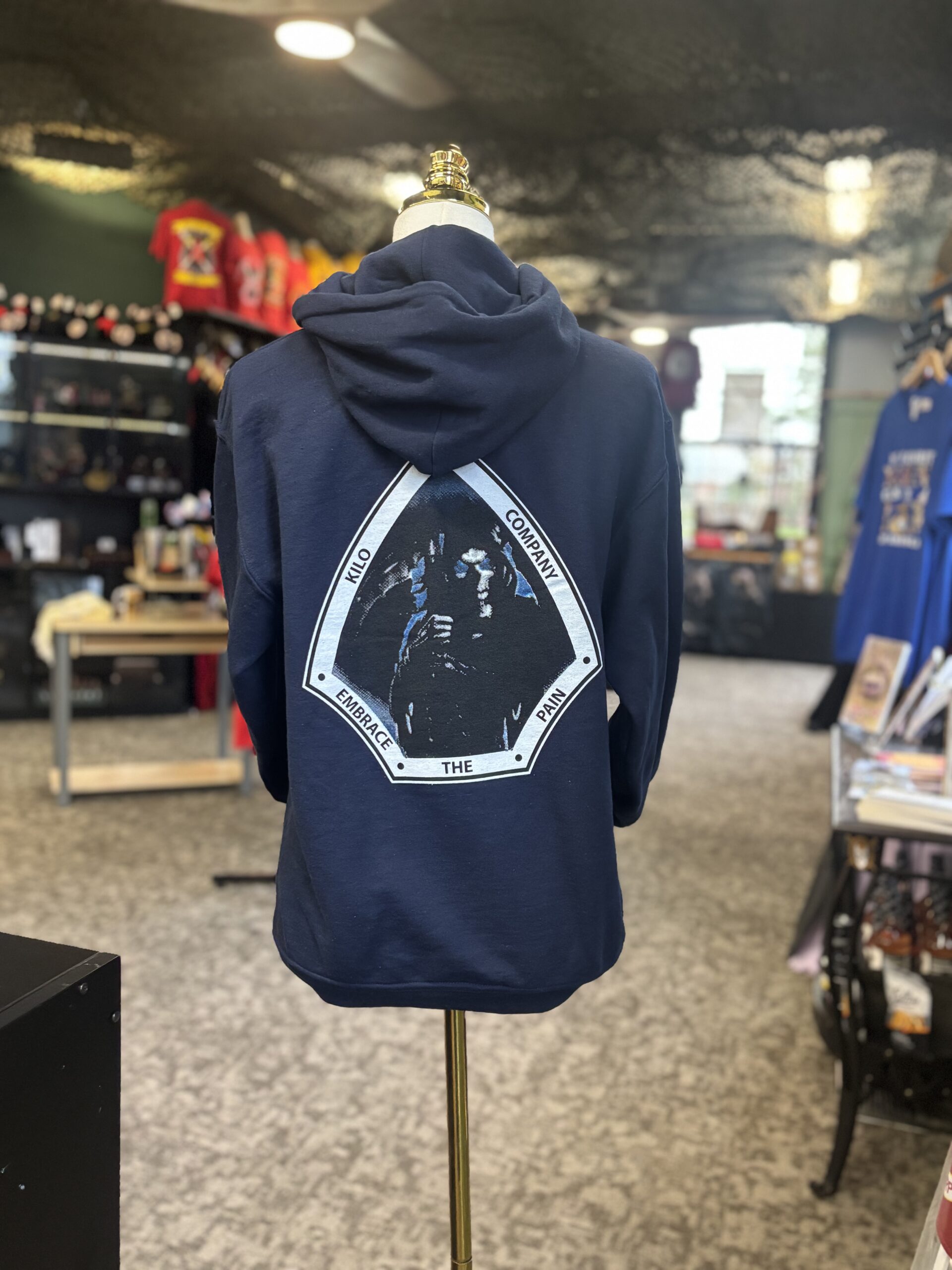 Stay warm and show your Company pride with a Kilo Company Pullover Hoodie! Featuring the 3rd Battalion logo on the front left and the Kilo Company logo on the back!