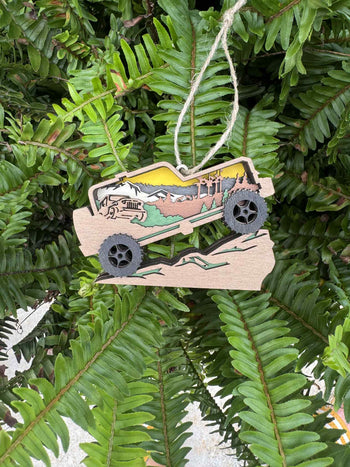 This layered wood design features a jeep shape on a large base with a jeep driving off road in a mountain and forest scene. *Please include a note with your...