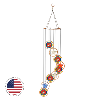 Show your support with our U.S. Marines Spiral Wind Mobile. This patriotic piece features 9 medallions – 4 featuring the U.S. Marines logo, and 4 stars. These cascade down in...