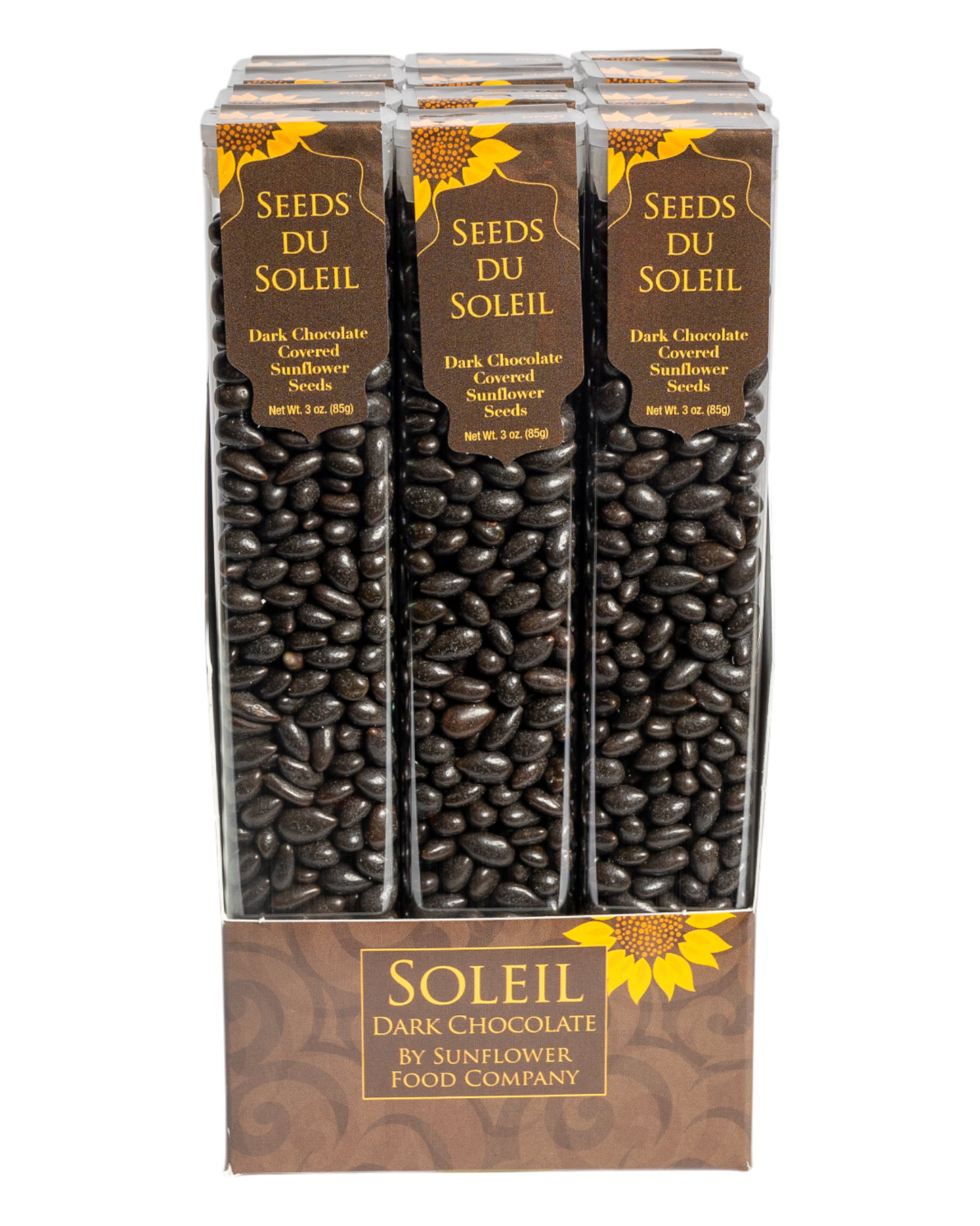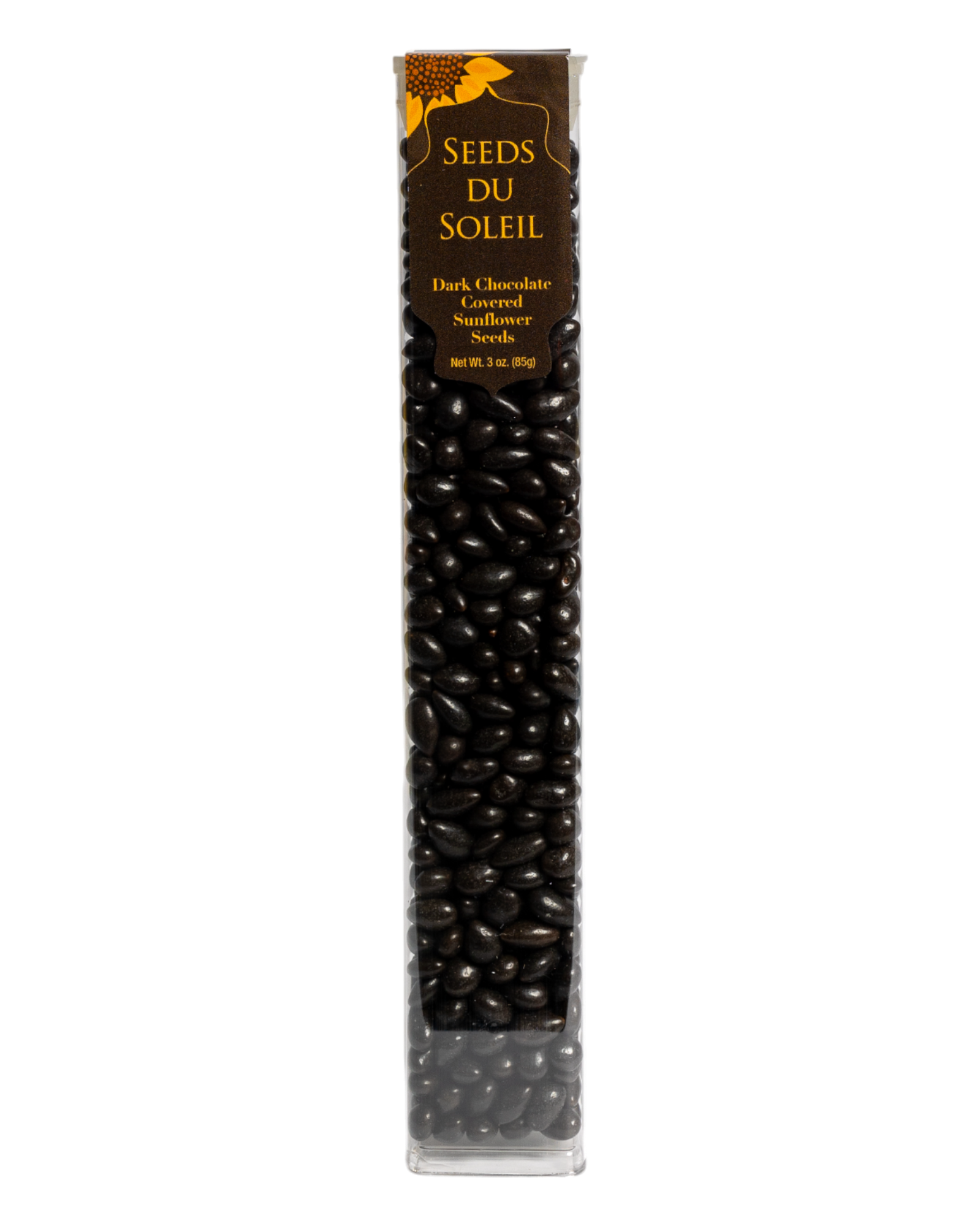 3 oz. tube filled with dark chocolate covered sunflower seeds. Live it up with Seeds du Soleil!