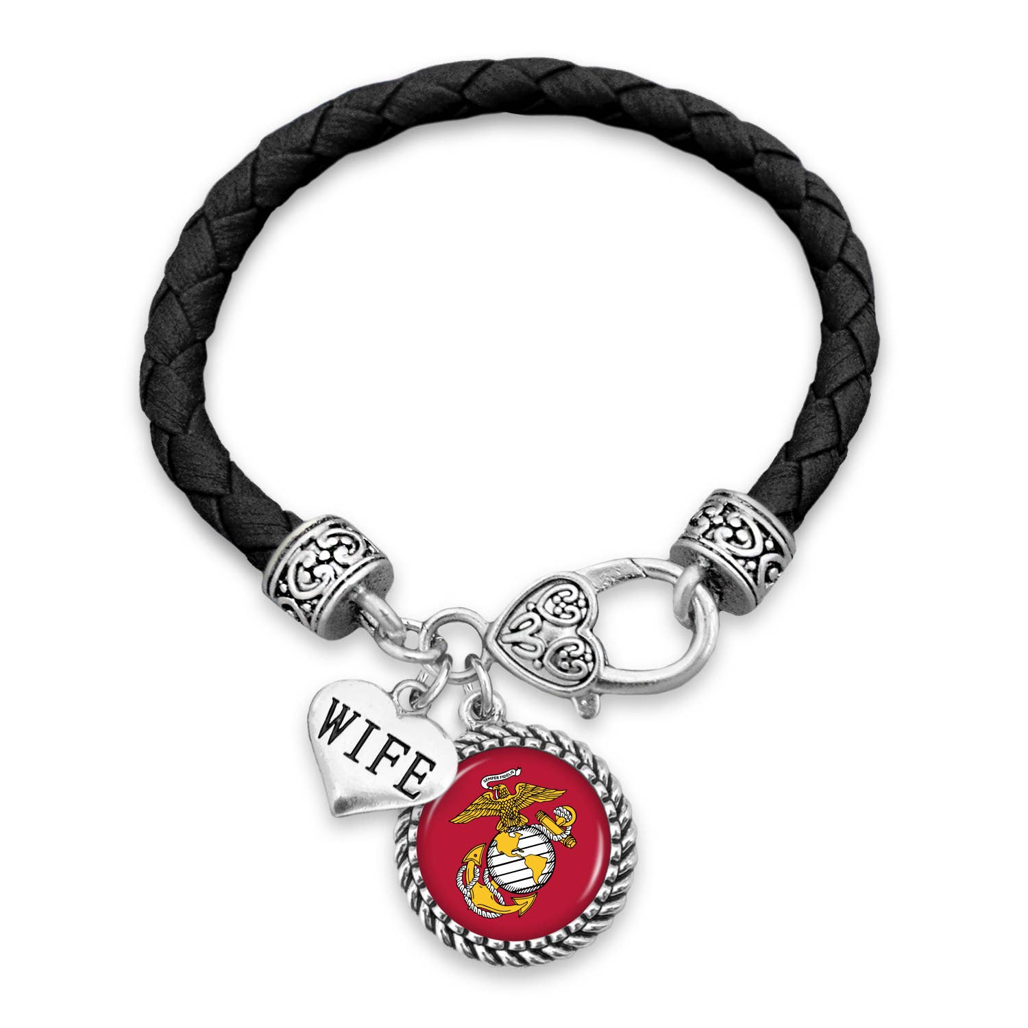 Our Military Wife Leather Bracelet is a delightful casual bracelet. The easy to wear leather bracelet makes this a huge hit year after year and features our braided charm with a large military logo and is proudly accented with a Wife charm! The bracelet is a faux leather bracelet with a bradied clasp for easy closure. All items are made from zinc alloy and are sealed with a anti-tarnish coating. Each piece is designed and assembled by working moms and grandmothers at our production office just outside Tulsa, Oklahoma. Some components are Made in China then assembled proudly in the USA.