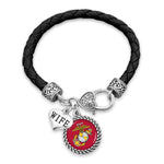 Triple your military pride with our Triple Charm jewelry collection. Each piece in this collection features a team color jewel, a silver logo charm and a nameplate with either Mom or Wife nameplate. Classy style meets military pride when you wear our triple charm Trifecta Collection. The necklace is an 18 inch double cable chain with a two inch extender so you can customize your length. The bracelet is a bangle with front closure. All items are made from zinc alloy and are sealed with a anti-tarnish coating. Each piece is designed and assembled by working moms and grandmothers at our production office just outside Tulsa, Oklahoma. Some components are Made in China then assembled proudly in the USA.