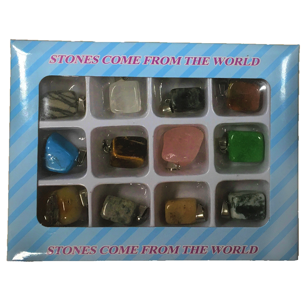 This retail boxed collection of gemstone pendants is a unique gift for kids and adults alike! Includes x12 assorted stone pendants ~0.5"-0.75" in length (vary in sizes), does NOT include chains or bracelet/necklace materials.