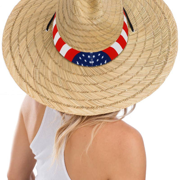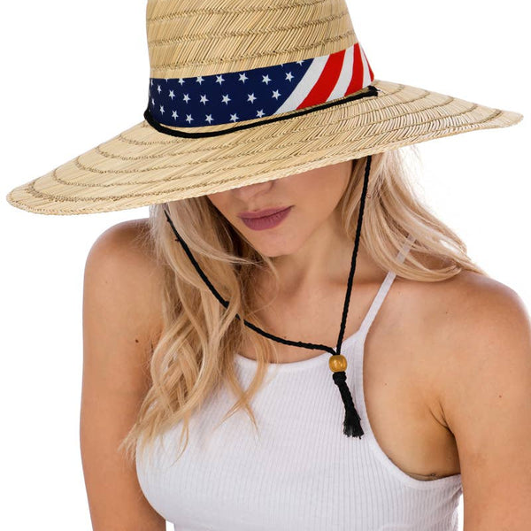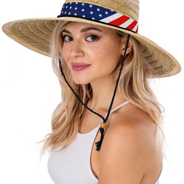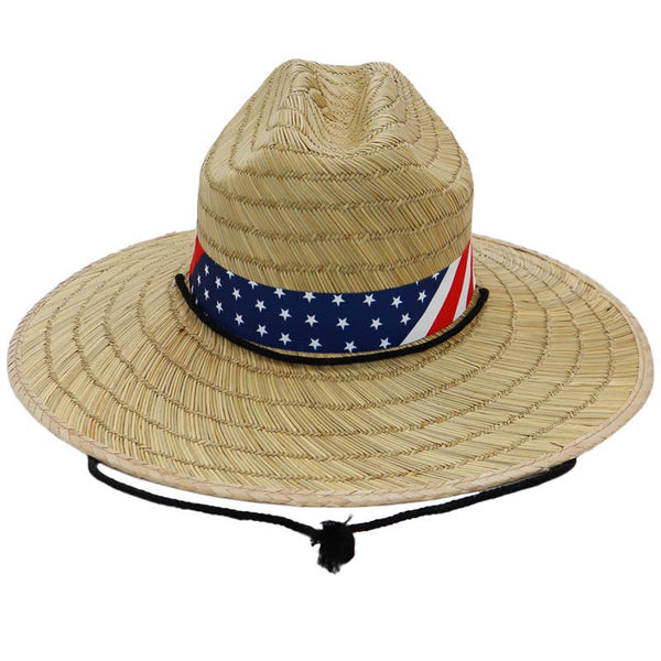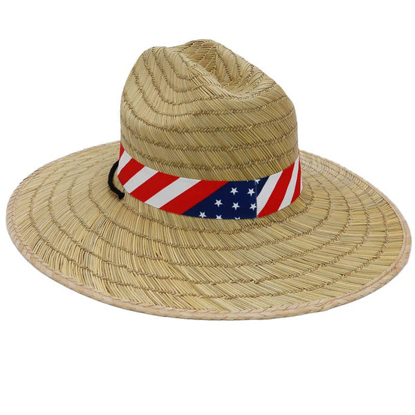 American Flag Band Wide Dome Brim Natural Rush Straw Woven Lifeguard Hat