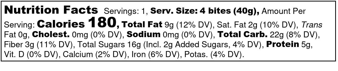This size is a one serving, on-the-go pack. 4 perfectly portioned bites per pouch. Look no further for the perfect snack - everything you need in one BITE! Our energy bites are packed with healthy fats, fiber, and protein, making them a convenient, healthy, on-the-go snack! Our clean, balanced ingredients sustain blood sugar levels and leave you feeling great all day.