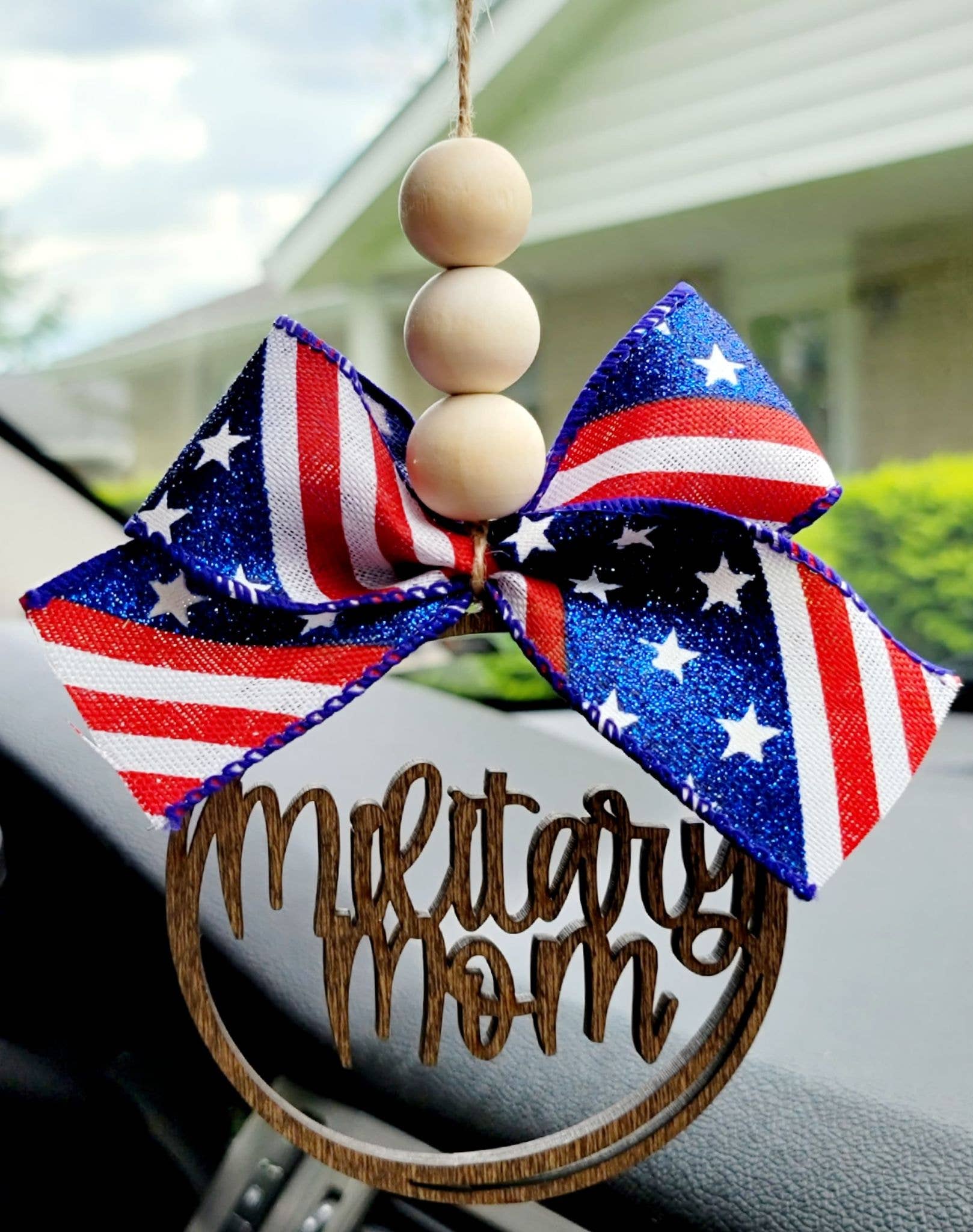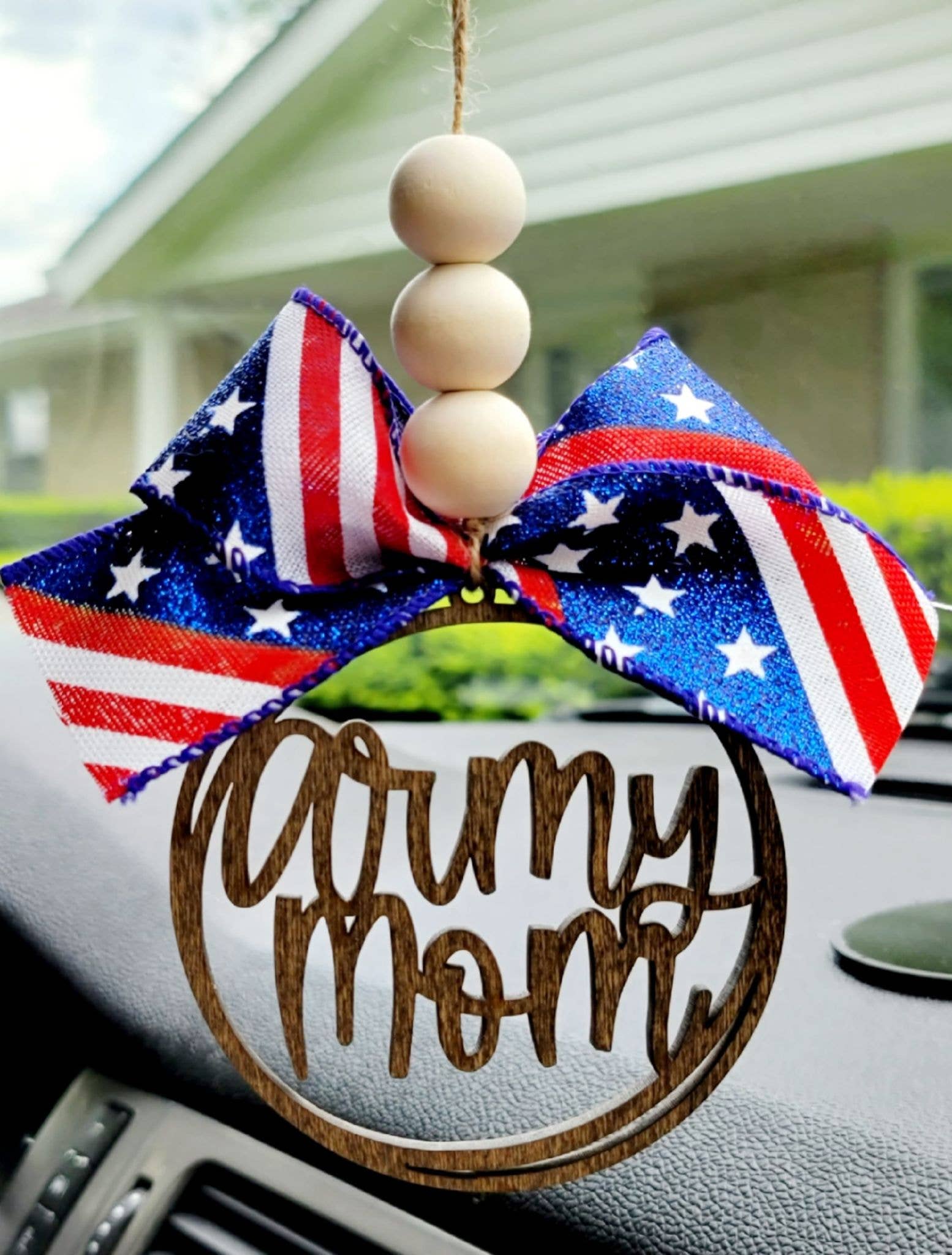 The charm is cut from sturdy 1/4” thick wood. We then hand stain, string, bow, and bead each charm. Next, we individually bag and label each completed charm for a nice and neat packaged product.