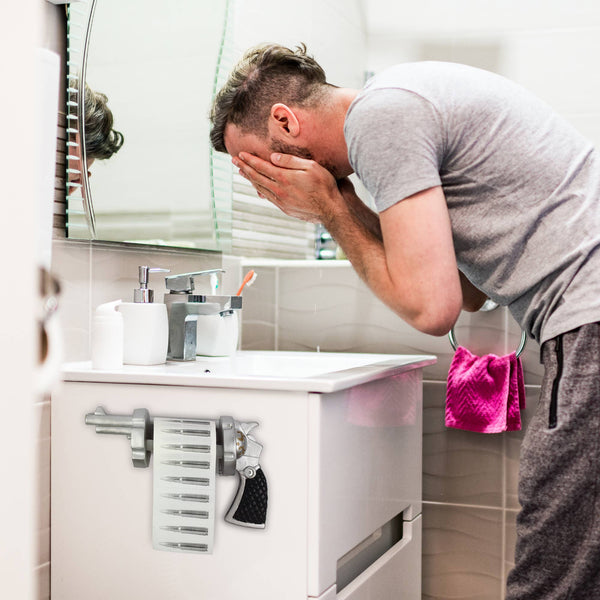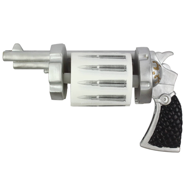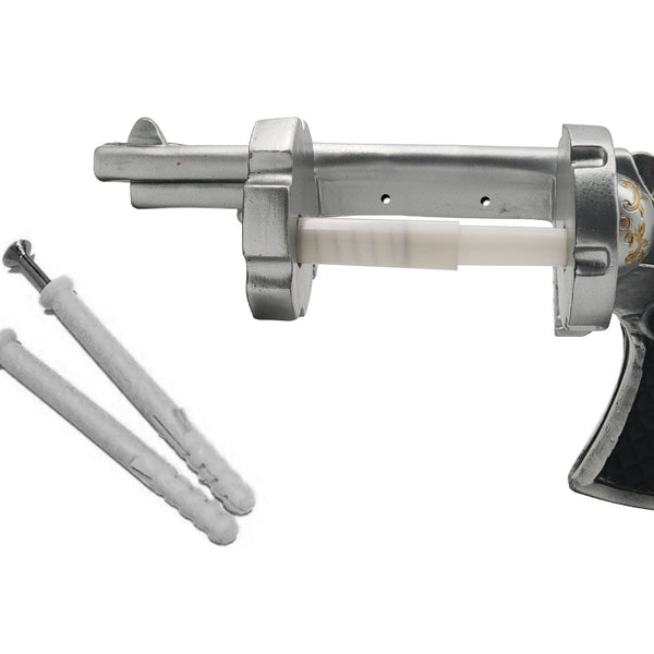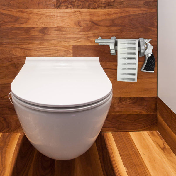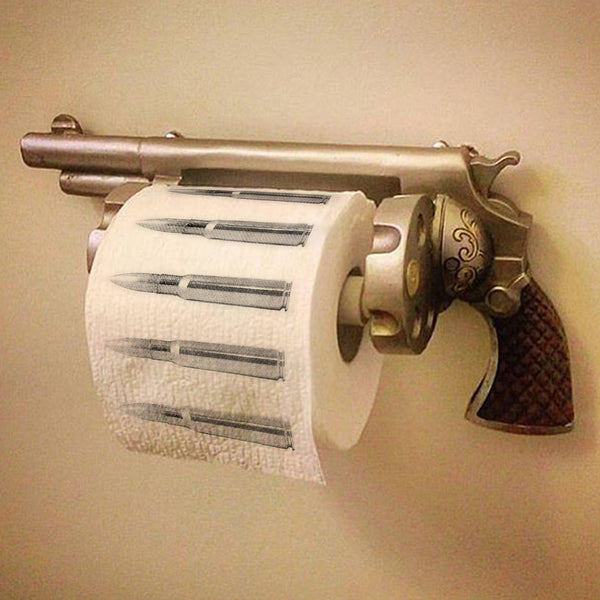 The unique design looks like a real revolver, but holds a roll of toilet paper in place of the bullet chamber. Use the toilet paper holder in your downstairs or guest bath to complete your home's design and give visitors an unexpected surprise.
