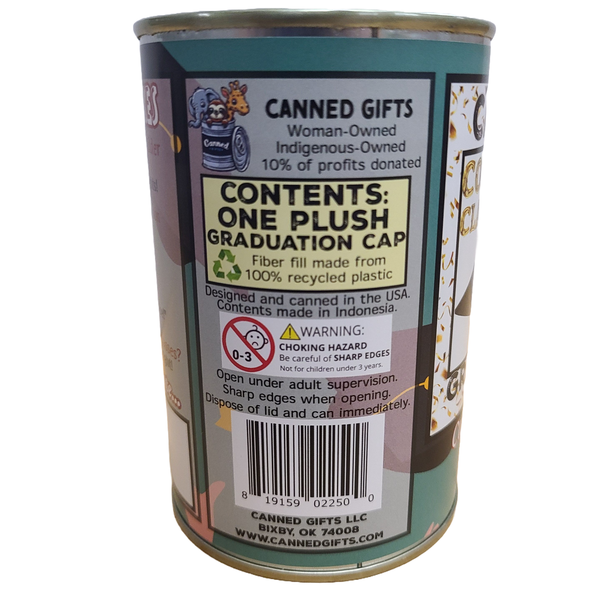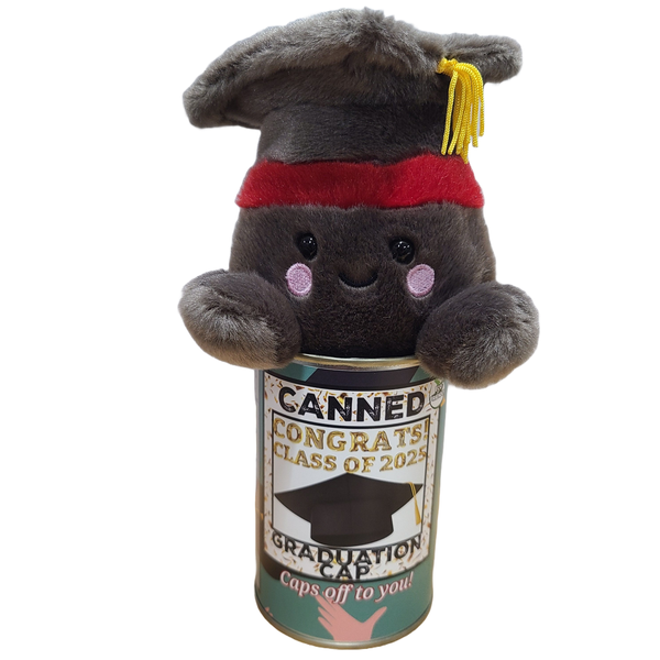 • Graduation Cap plush sealed in a can. Use a can opener to open the fun gift or choose the pop top lid!