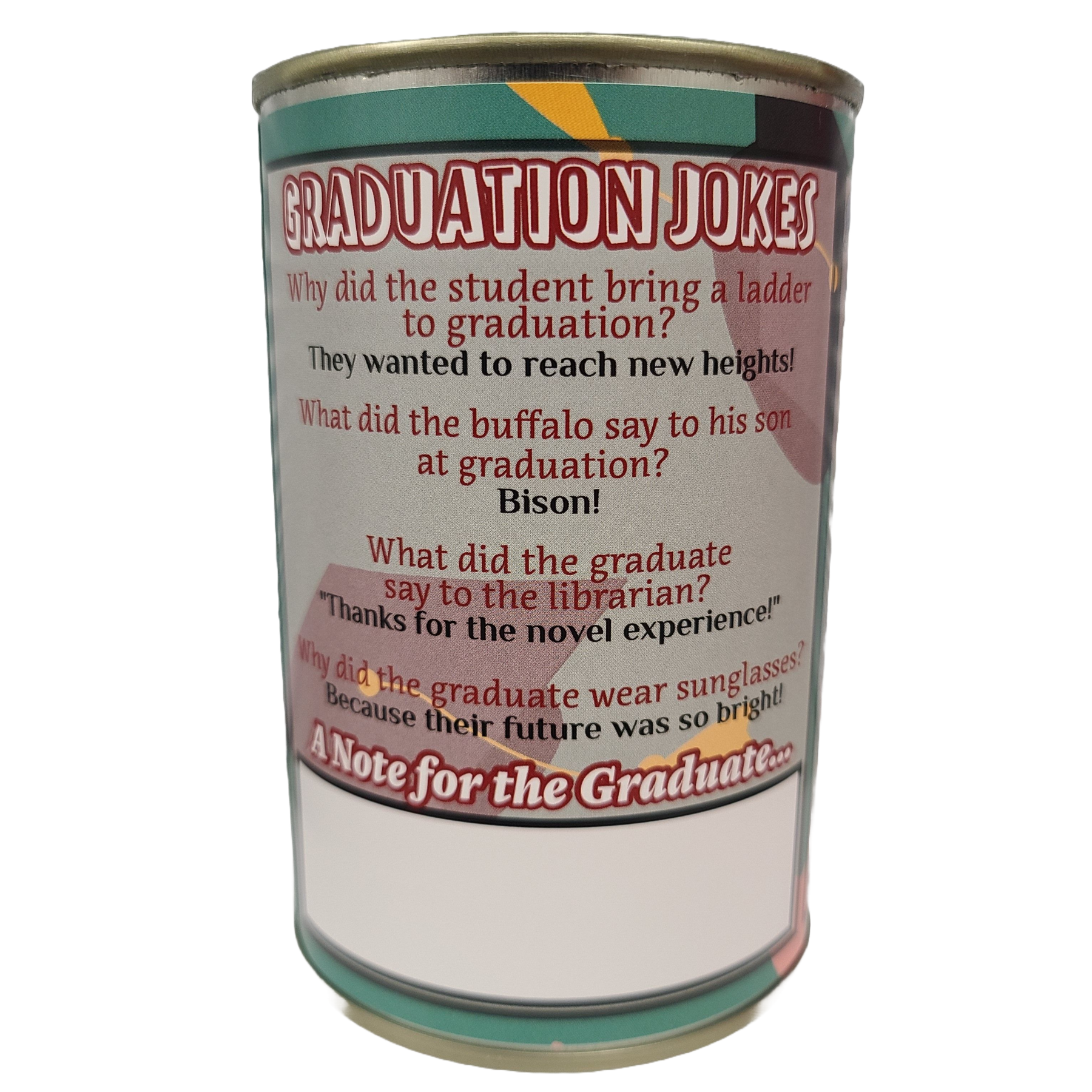 • Funny graduation jokes on the can. A place for the gift giver to write a note to the graduate.