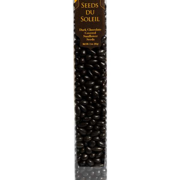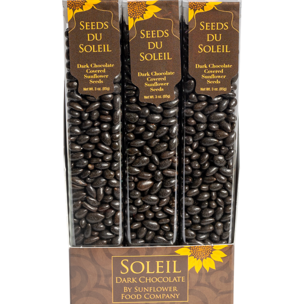 3 oz. tube filled with dark chocolate covered sunflower seeds. Live it up with Seeds du Soleil! - 24 units/case (2/12 count displays)
