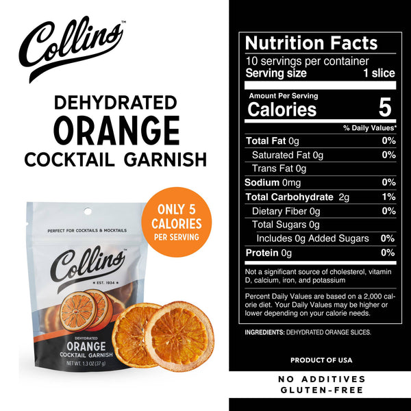 Collins Dehydrated Orange Cocktail Garnishes add a bright, citrusy touch to cocktails, mocktails, and dishes. Preserved for vibrant flavor and color, they're perfect for enhancing a Negroni, Old Fashioned, Spritz mocktail, or a dessert with a sweet, fruity accent.