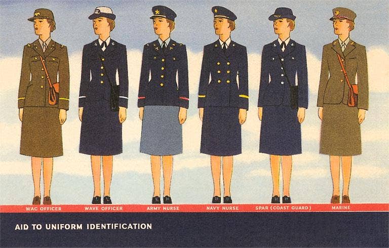 Postcard ML-80 Women's Military Uniform Identification. This is a Postcard 3.5" x 5.5" featuring an image from our Military collection titled Women's Military Uniform Identification. Search keywords: Military,1940s,WACs,Waves,nurses,landscape,horizontal,illustration