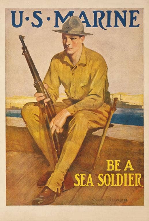 Postcard ML-91 US Marine, Be a Sea Soldier. This is a Postcard 3.5" x 5.5" featuring an image from our Military collection titled US Marine, Be a Sea Soldier. Search keywords: Military,recruitment,poster,uniform,vertical,portrait,painting,illustration
