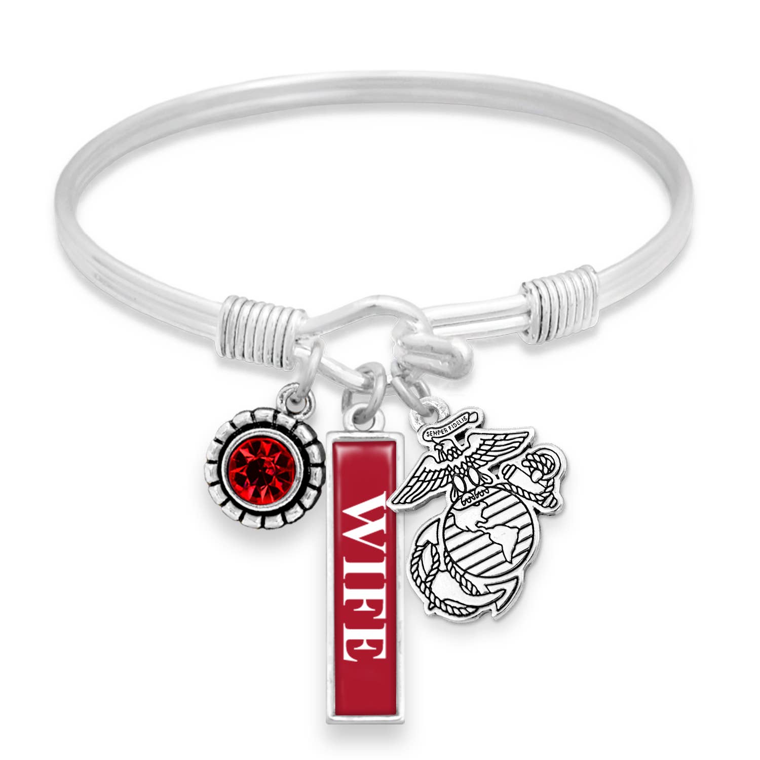 Triple your military pride with our Triple Charm jewelry collection. Each piece in this collection features a team color jewel, a silver logo charm and a nameplate with either Mom or Wife nameplate. Classy style meets military pride when you wear our triple charm Trifecta Collection. The necklace is an 18 inch double cable chain with a two inch extender so you can customize your length. The bracelet is a bangle with front closure. All items are made from zinc alloy and are sealed with a anti-tarnish coating. Each piece is designed and assembled by working moms and grandmothers at our production office just outside Tulsa, Oklahoma. Some components are Made in China then assembled proudly in the USA.