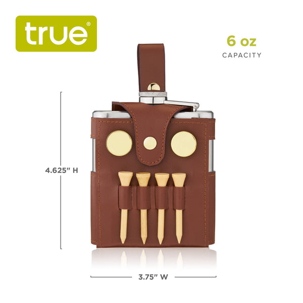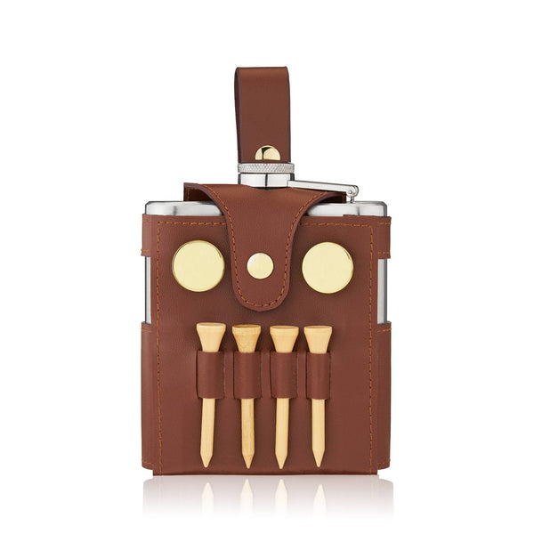Includes: 1 Flask, 4 wooden golf tees, 2 ball markers, 1 divot tool & a carrying case with strap.
