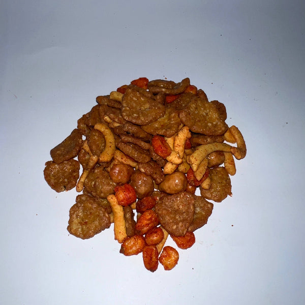 Honey Roasted Sesame Chips, Honey Roasted Peanuts, Hot Churritos and Cajun Corn Sticks. Awesome, addicting gourmet snack mix! Great snack for on the run purchases!