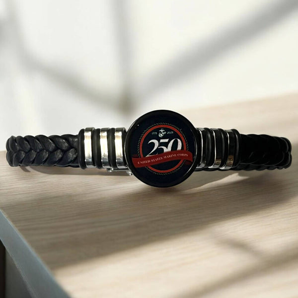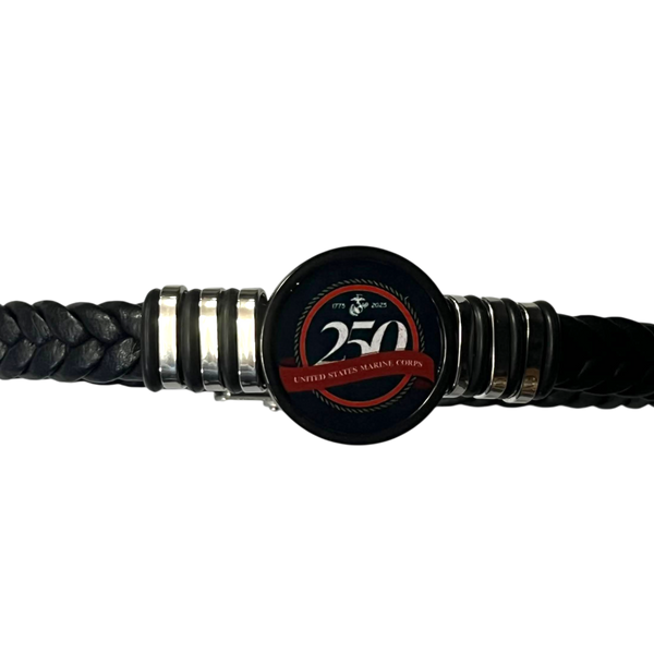 Celebrate the Marine's 250th anniversary with this stylish braided leather bracelet. It features a striking centerpiece commemorating this historic milestone, perfect for showing your Marine pride. The high-quality leather and commemorative design make it both a meaningful and durable accessory. Benefits and Features: Marine 250th Anniversary Design High-Quality Materials Versatile Styling Patriotic and Meaningful Supports Handmade Craftsmanship Black braided leather band 250th Anniversary Commemorative Centerpiece Adjustable closure Durable and long-lasting Handmade with care