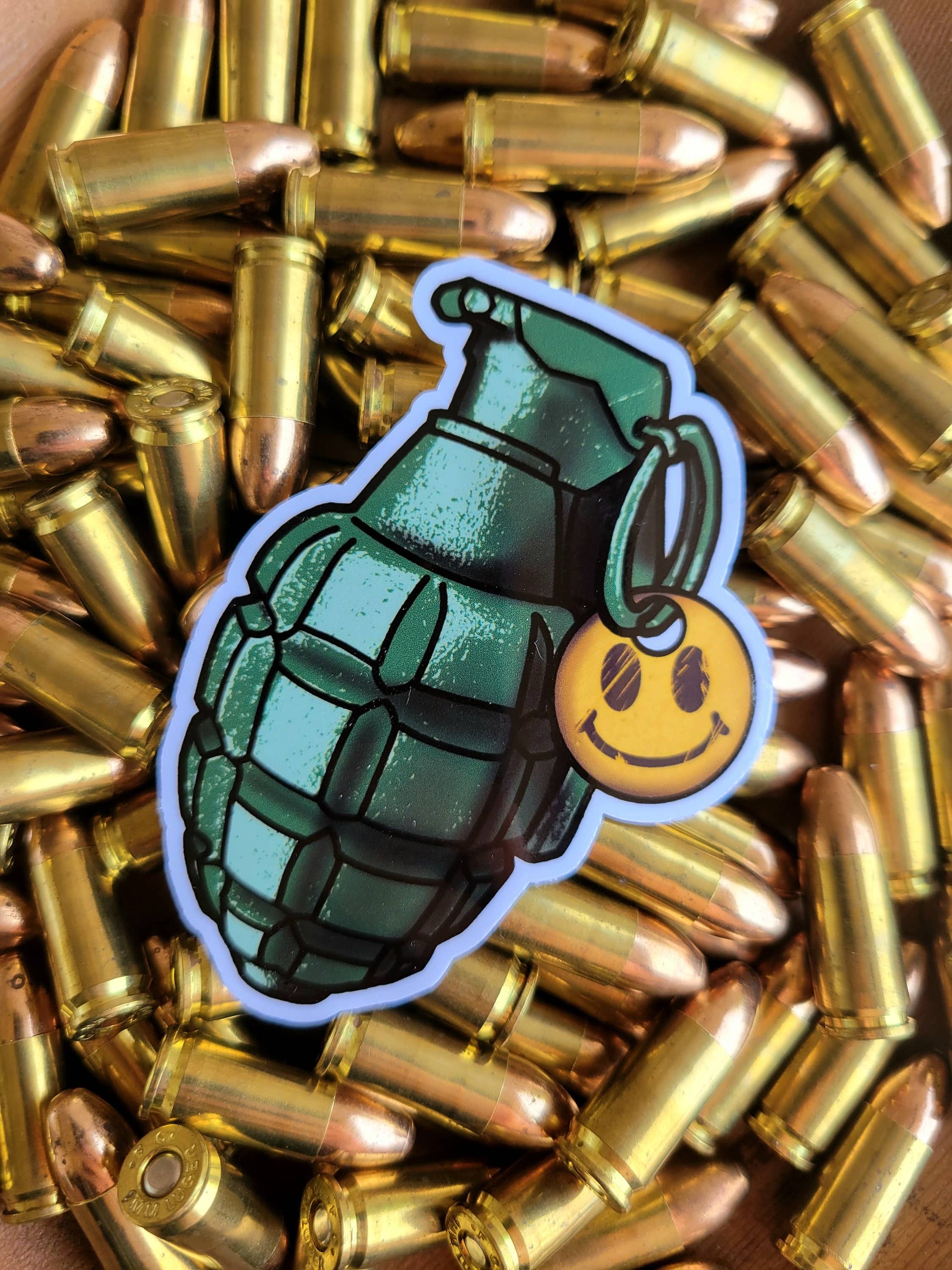 Turn that frown way, way, way upside down with this special hand grenade sticker!