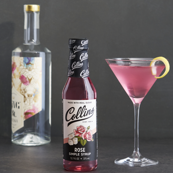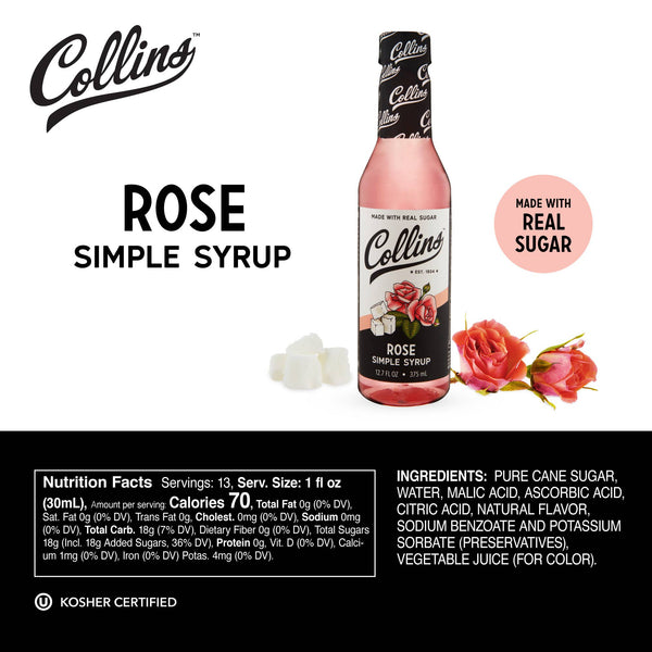 Collins Rose Simple Syrup is a staple for any home bar. Made with real sugar, it offers the perfect complement to any craft cocktail and adds a floral hint of rose flavor to drinks, desserts, and more.