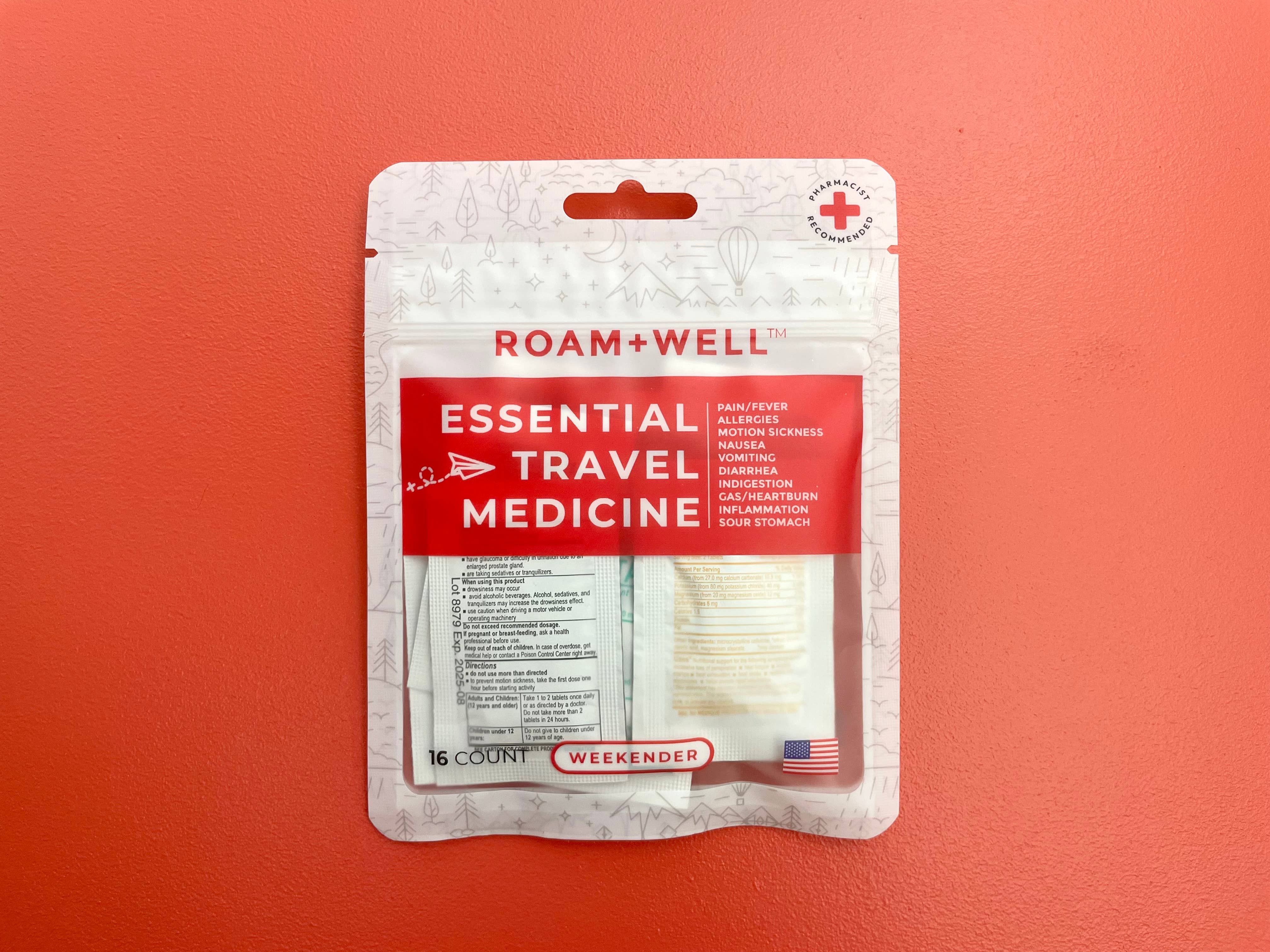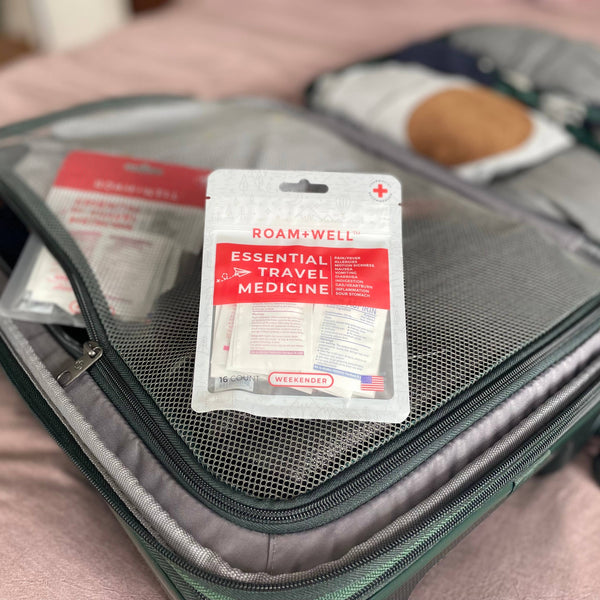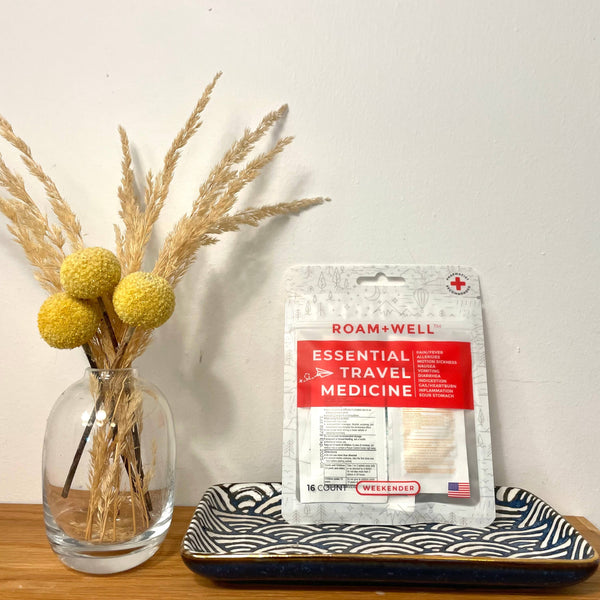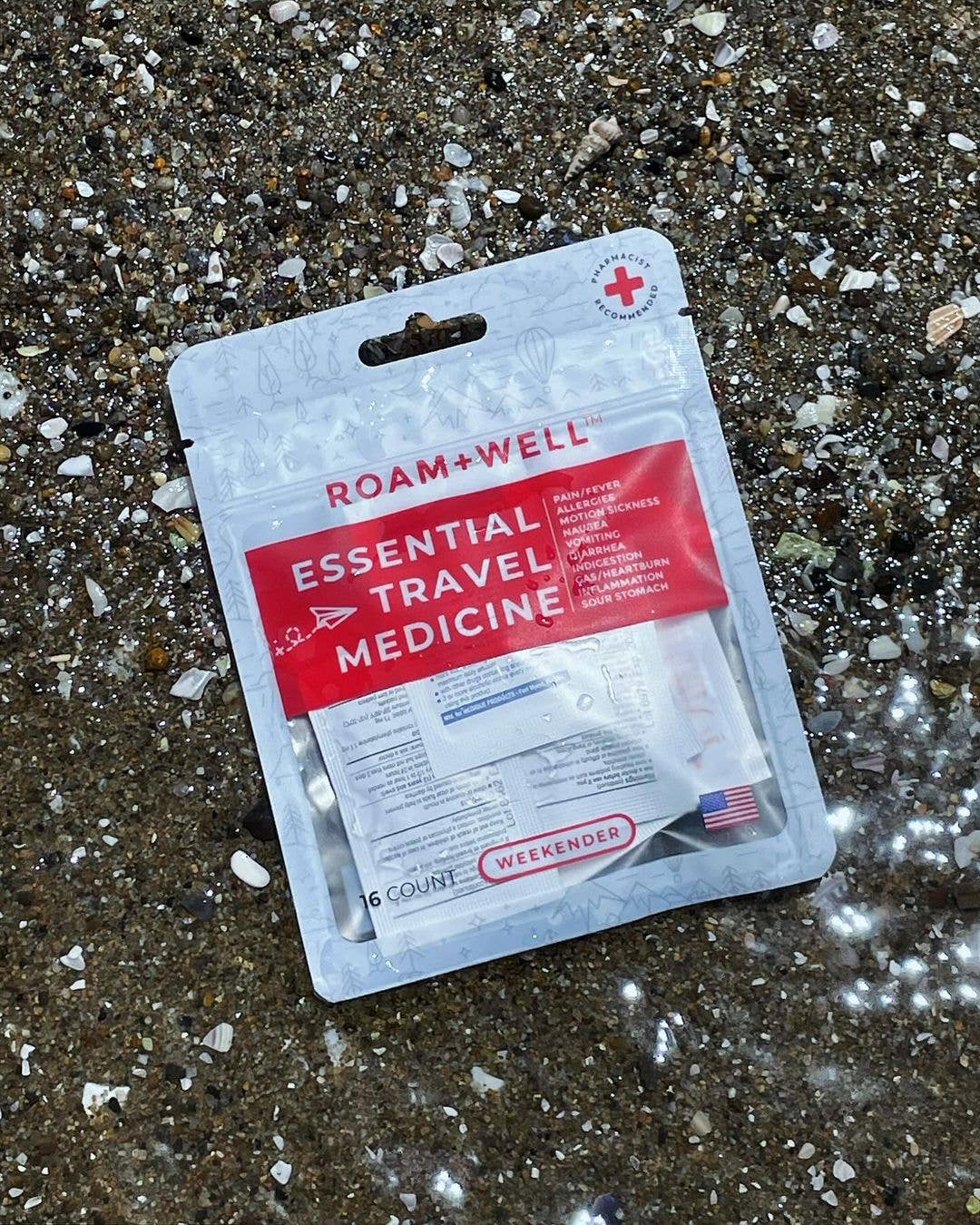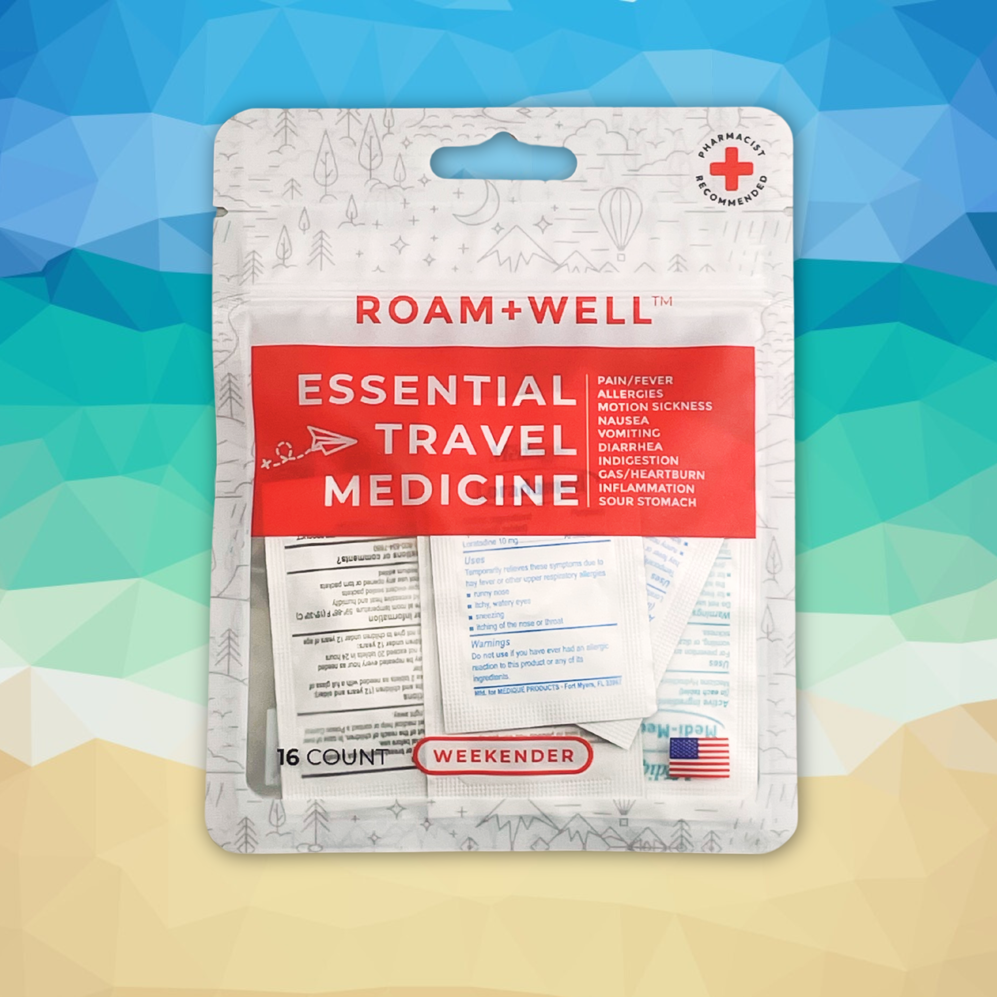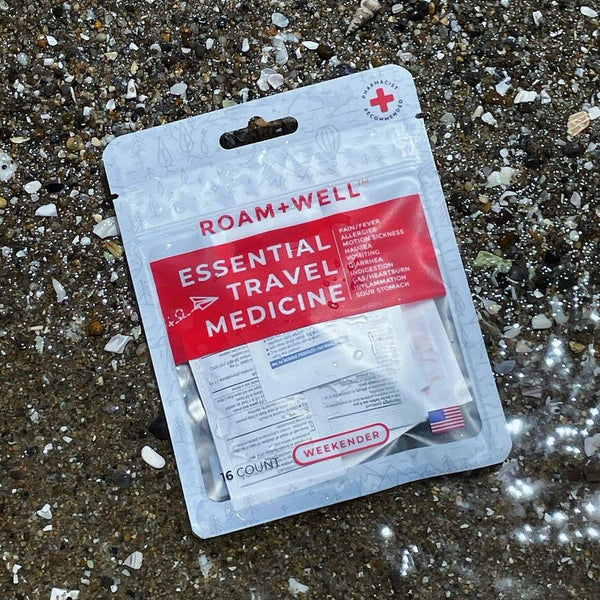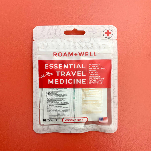 Prepare for your next adventure with the Roamwell Weekender, your all-in-one solution for travel health and wellness. Whether you're exploring new cities, hiking in the mountains, or lounging on the beach, this compact and convenient travel medicine kit has you covered. What's Included: 2 x APAP (Acetaminophen 325mg) - Relieve pain and reduce fever. 2 x Aspirin (325 mg) - Soothe pain and reduce inflammation. 2 x Loradamed (Loratadine 10mg) - Alleviate allergies and relieve symptoms of hay fever. 2 x Diphen (Diphenhydramine 25mg) - Alleviate allergies, nausea, and aid in sleep. 2 x Diotame (Bismuth Subsalicylate 262mg) - Relieve symptoms of diarrhea and upset stomach. 2 x Medi-Meclizine (Meclizine 25 mg) - Prevent motion sickness and nausea. 2 x Antacid (Calcium Carbonate 420mg) - Neutralize stomach acid and relieve heartburn. 2 x Electrolytes (Calcium 10.8 mg, Potassium 40 mg, Magnesium 12mg) - Replenish electrolytes and stay hydrated.