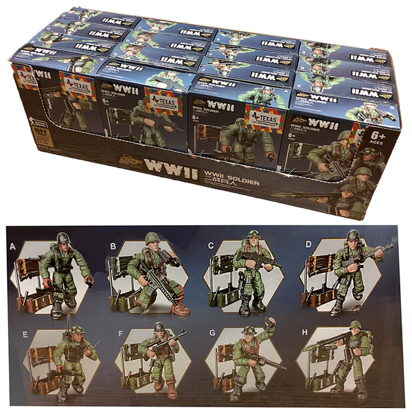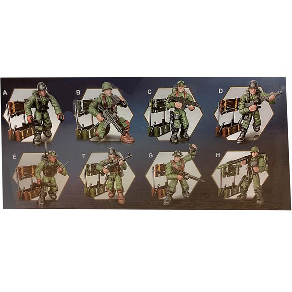This display of WWII Military Soldier Figurines includes x16 soldiers, x2 units of each style as pictured. Each kit comes with assembly instructions and a variety of accessories.