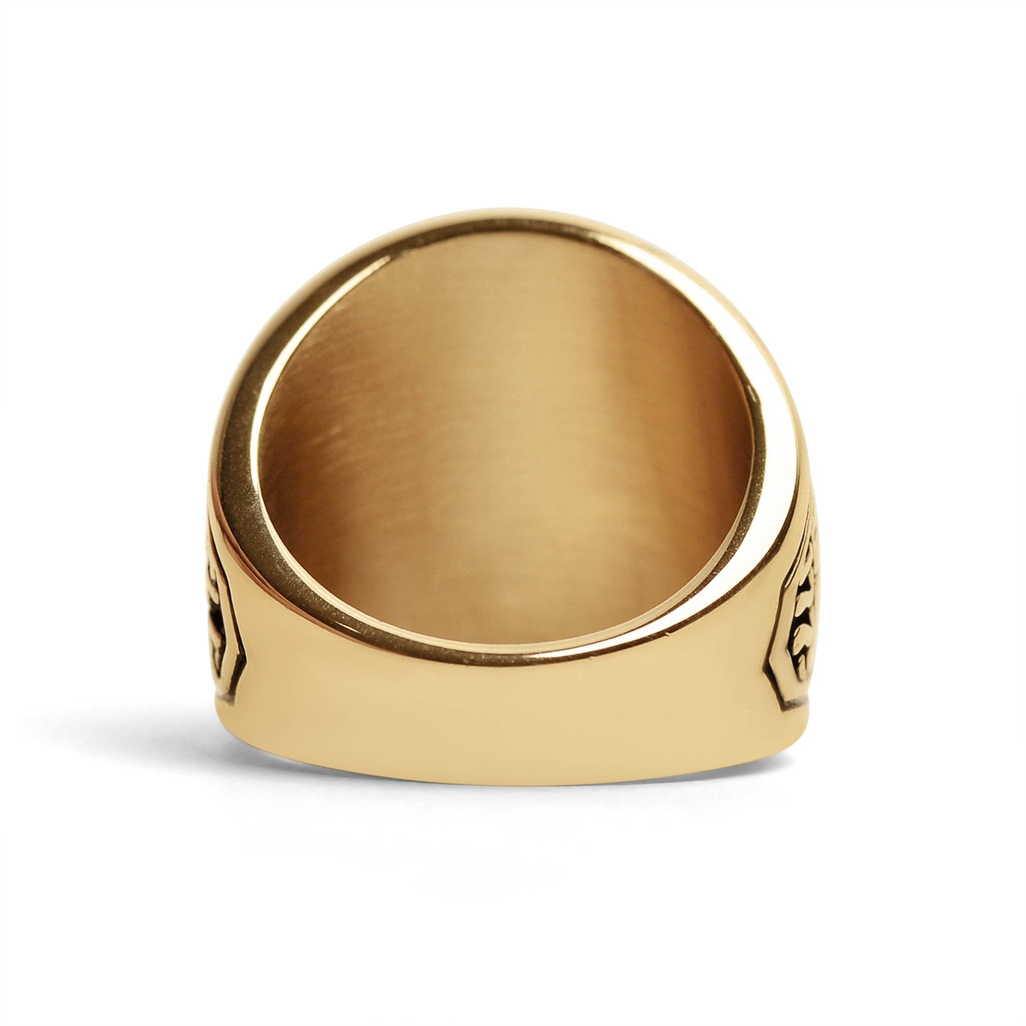 The18K Gold-PVD Coated United States Marines Stainless Steel Ring is a stunning tribute to the courageous men and women who serve the country. Expertly crafted with a brilliant red stone center, this ring is PVD Coated in a rich 18K gold finish that adds a bold elegance to the overall look. It's the perfect way to show your support for the brave and honorable who protect our freedom and risk their lives every day for the United States. Whether you're a Marine or someone looking for a special gift to give to a loved one, this ring is a conversation piece that will get noticed anytime its worn!  ✦ Strong, durable, and don't easily break. ✦ 316L Surgical Grade Stainless Steel will never fade, tarnish or turn skin green, even when worn in the ocean or pool. ✦ Hypoallergenic, so don't worry about any breakouts or rashes! ✦ A great alternative to .925 Sterling Silver. Approx. Weight: 51 grams Available Sizes: 8, 9, 10, 11, 12, 13, 14, 15, 16