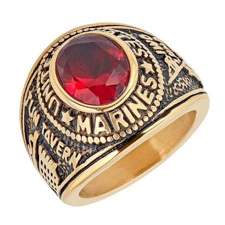 The18K Gold-PVD Coated United States Marines Stainless Steel Ring is a stunning tribute to the courageous men and women who serve the country. Expertly crafted with a brilliant red stone center, this ring is PVD Coated in a rich 18K gold finish that adds a bold elegance to the overall look. It's the perfect way to show your support for the brave and honorable who protect our freedom and risk their lives every day for the United States. Whether you're a Marine or someone looking for a special gift to give to a loved one, this ring is a conversation piece that will get noticed anytime its worn!